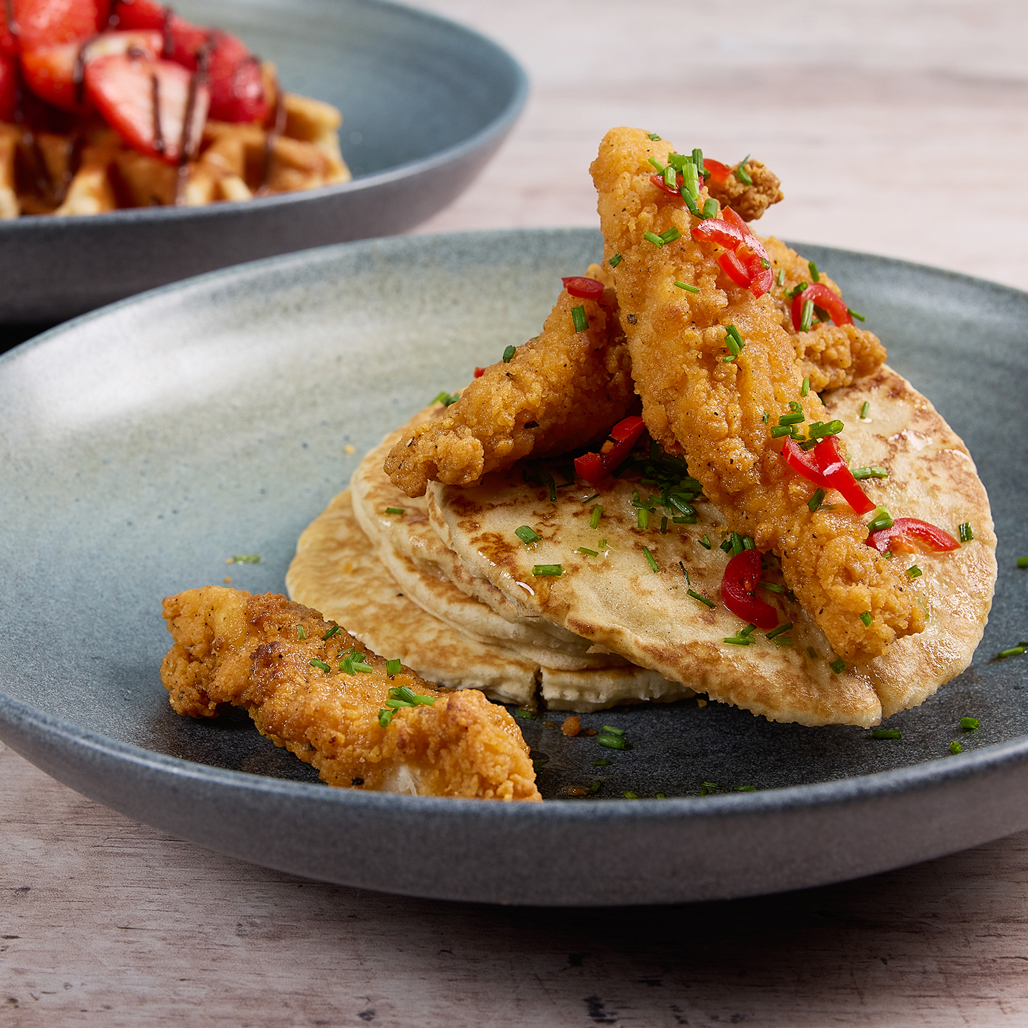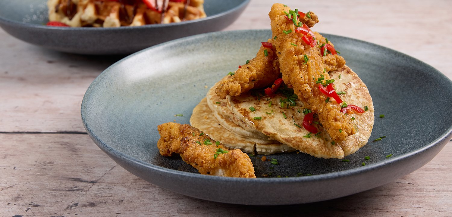 Three chicken goujons stacked atop five pancakes, finished with a drizzle of hot honey and a sprinkle of chillies and chopped spring onion. 705kcal