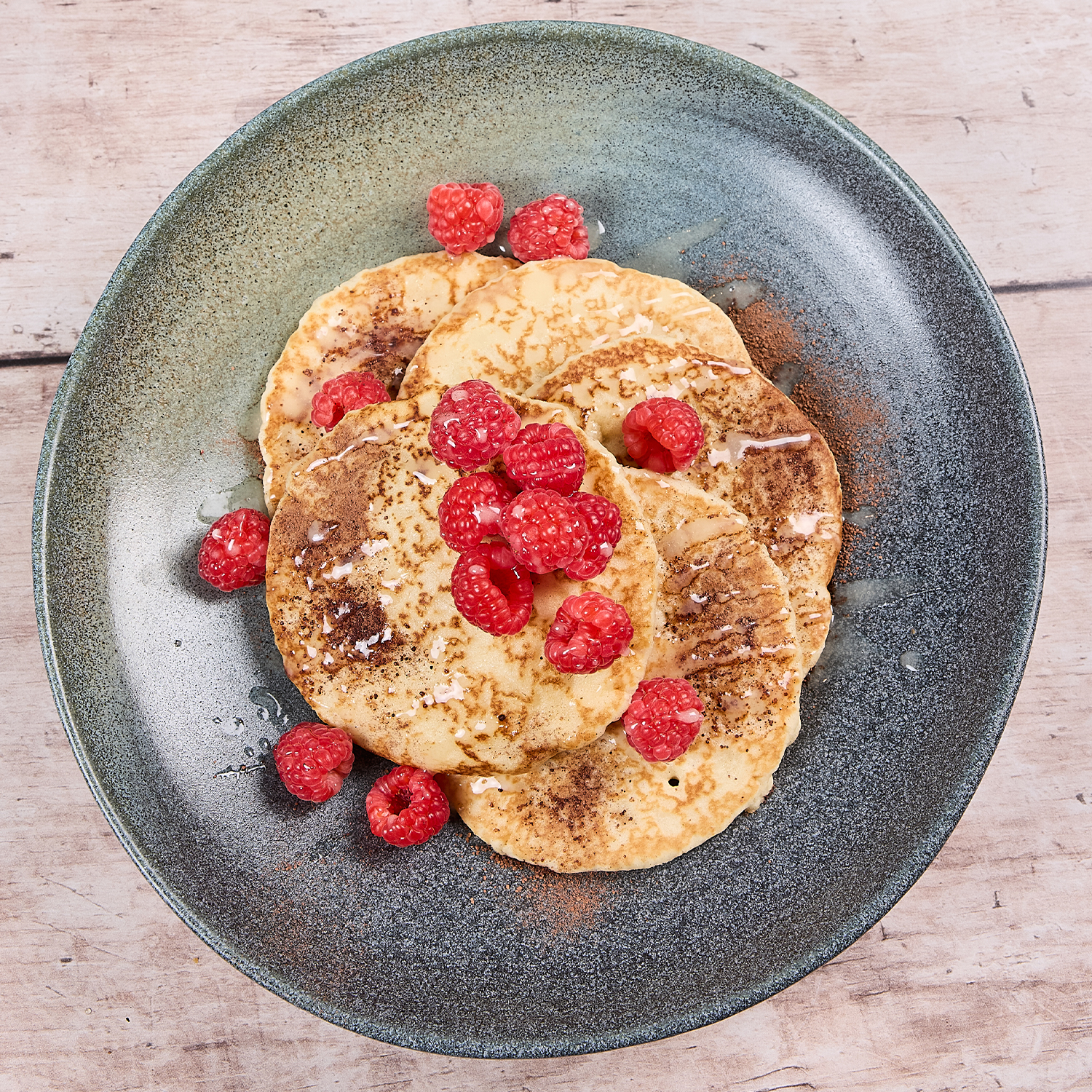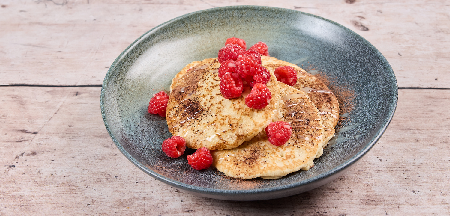 A pancake stack topped with fresh raspberries, finished with a chocolate dusting and a drizzle of white chocolate sauce. 619kcal