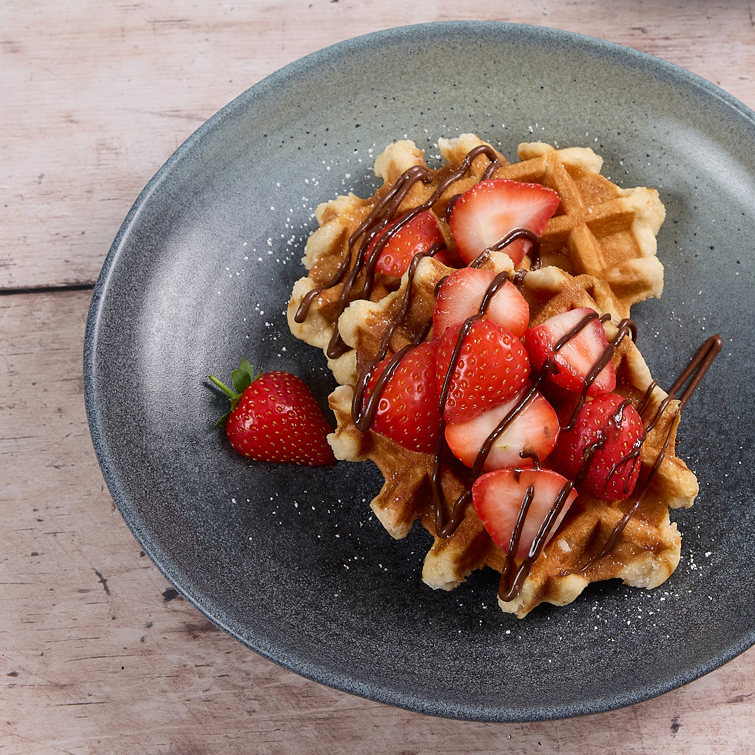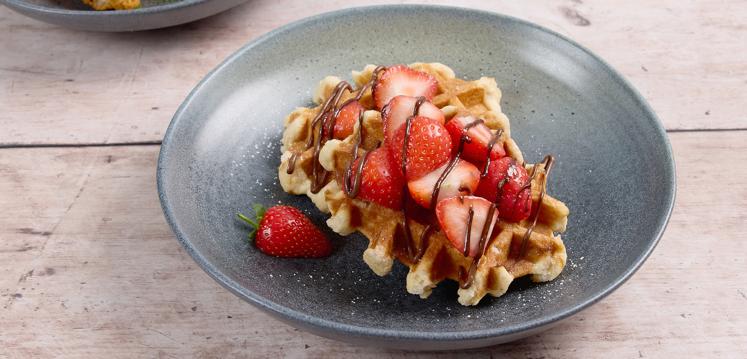 Two Belgian-style waffles garnished with fresh strawberries, a chocolate hazelnut drizzle and a dusting of icing sugar. 1,088kcal