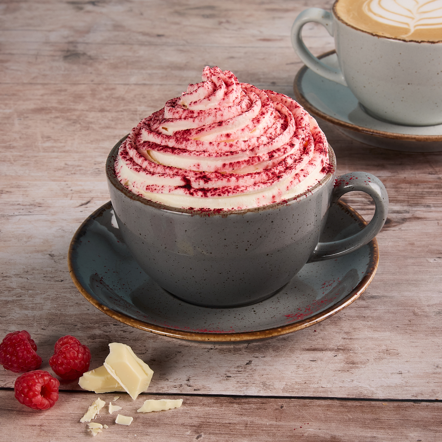 Organic, Fairtrade hot chocolate, softly balanced with white chocolate and raspberry flavours, finished with vanilla vegan whipped cream and a dusting of beetroot powder. 303kcal / 417kcal