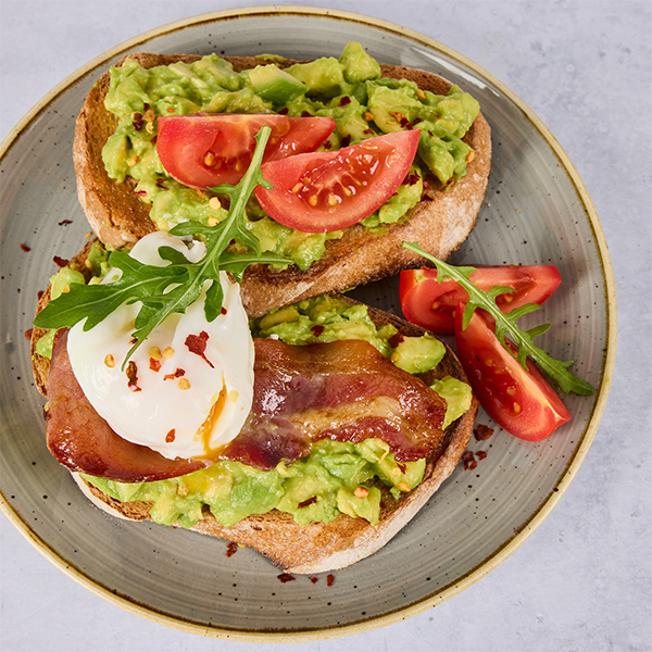 Smashed avocado, tomato, rasher of bacon, poached egg, rocket and chilli flakes on two slices of toasted sourdough. 499kcal