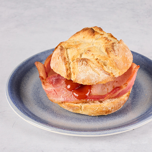 Two rashers of bacon in a potato roll served with a choice of ketchup or brown sauce. 514kcal