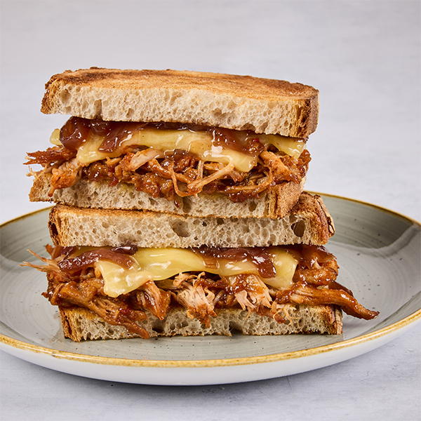 Two slices of sourdough, pulled pork, cheddar, cheese slices and red onion chutney. 541kcal