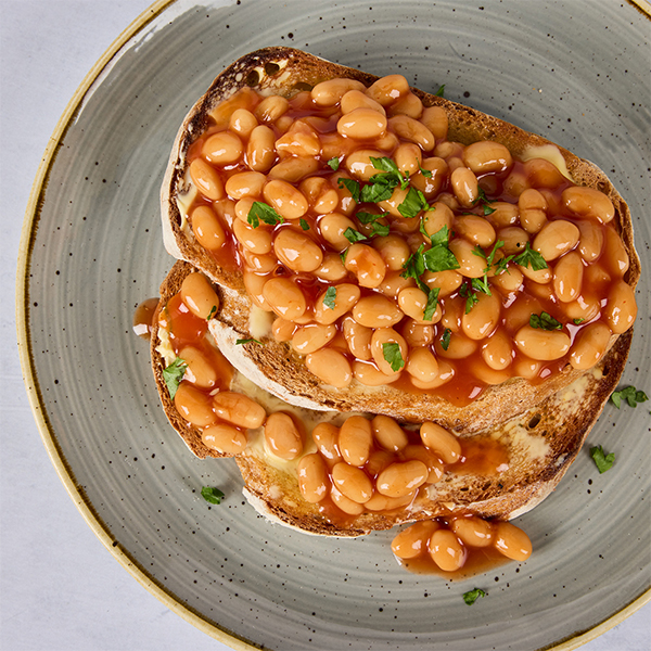 Baked beans on two slices of buttered sourdough, garnished with chopped chives. 452kcal