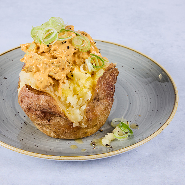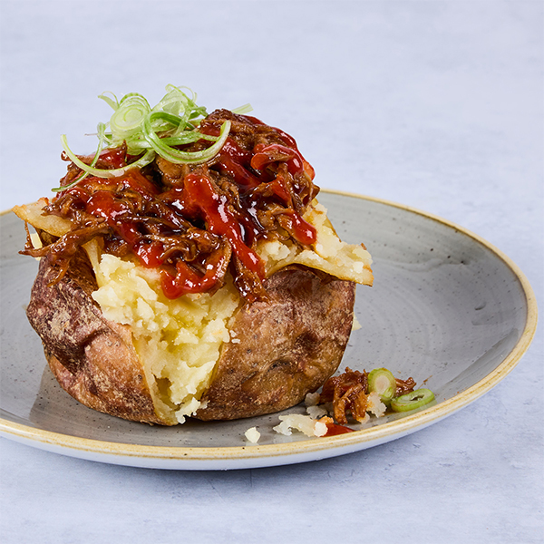 Pulled pork garnished with spring onion and sriracha, served with a butter portion. 450kcal