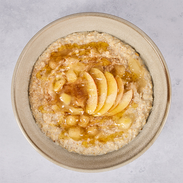 Porridge oats topped with sweet cinnamon apples, ground cinnamon and red apple slices. 507kcal