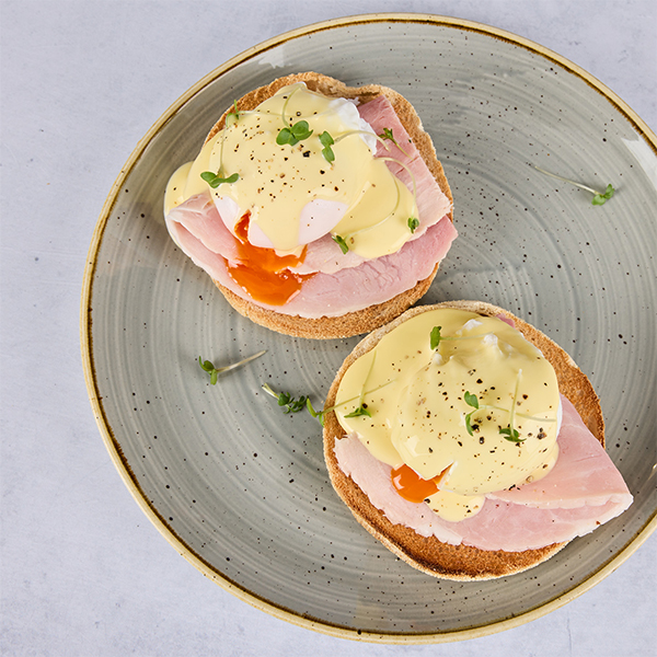British ham, two poached eggs, hollandaise sauce and black pepper on a toasted English muffin. 705kcal