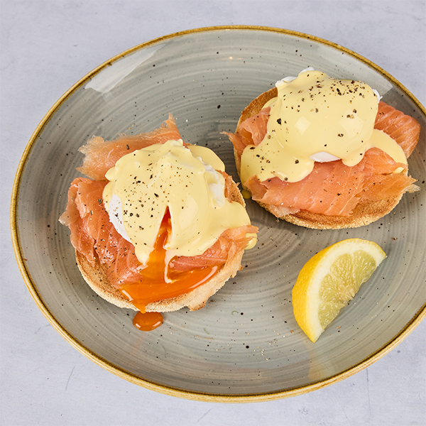 Smoked salmon, two poached eggs, hollandaise sauce and black pepper on a toasted English muffin. 824kcal