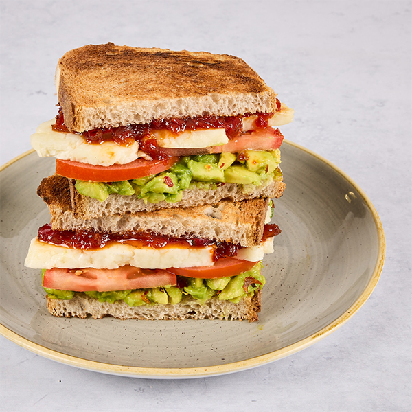 Two slices of sourdough, smashed avocado, halloumi, tomato slices and chilli jam. 568kcal