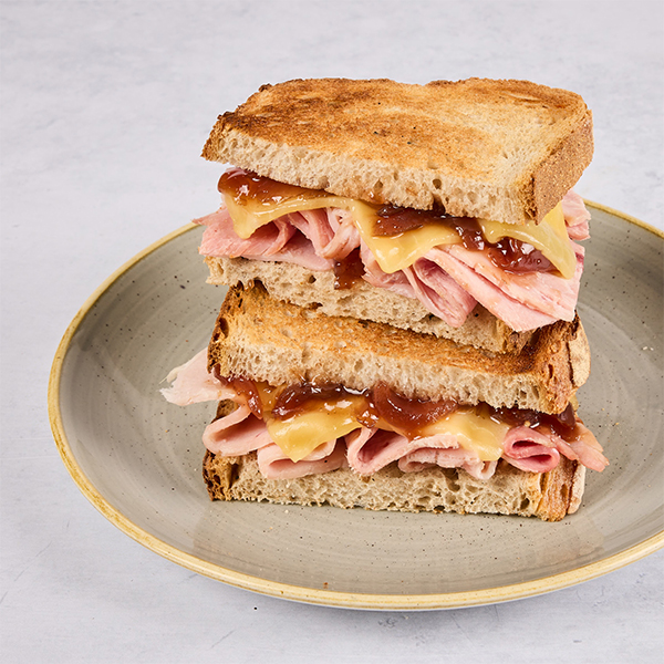 Two slices of sourdough, British ham, cheddar cheese slices and red onion chutney. 494kcal