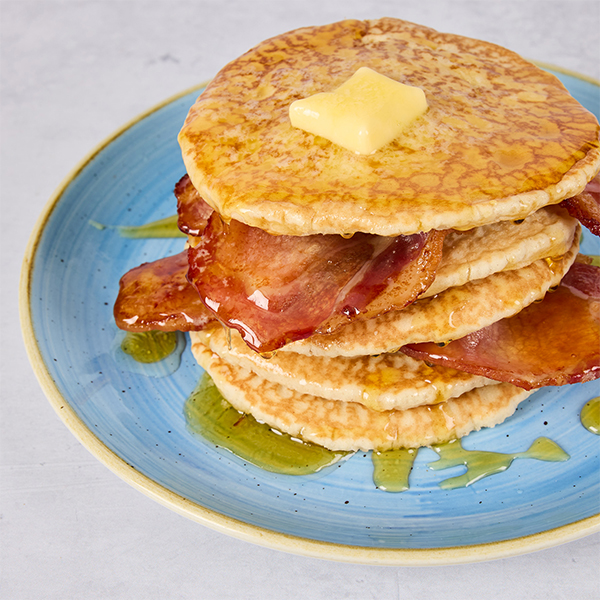 Five pancakes topped with two rashers of bacon, a drizzle of maple syrup and a butter portion. 718kcal