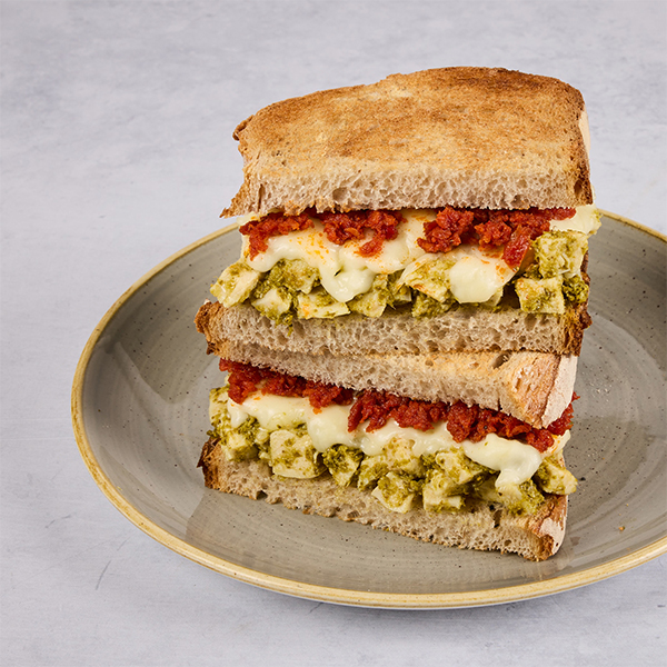 Two slices of sourdough, pesto chicken, nduja and grated mozzarella. 718kcal