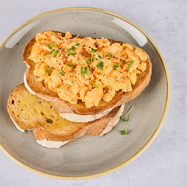Two scrambled eggs and black pepper on two slices of buttered sourdough. 490kcal